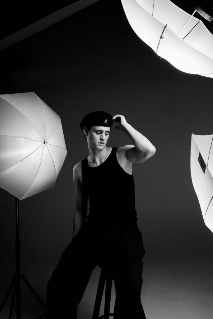Captured in high-contrast black and white, the series focuses on the dialogue between light and shadow. Working exclusively with umbrellas as light shapers allowed me to experiment with how soft light can still create hard, architectural lines within a monochrome space. The model was directed to move naturally, allowing for a candid yet sculptural flow that perfectly complemented the static, metallic structures of the studio gear. This project is a celebration of the photographic process itself—turning the „behind the scenes“ into a clean, minimalist, and timeless piece of art.