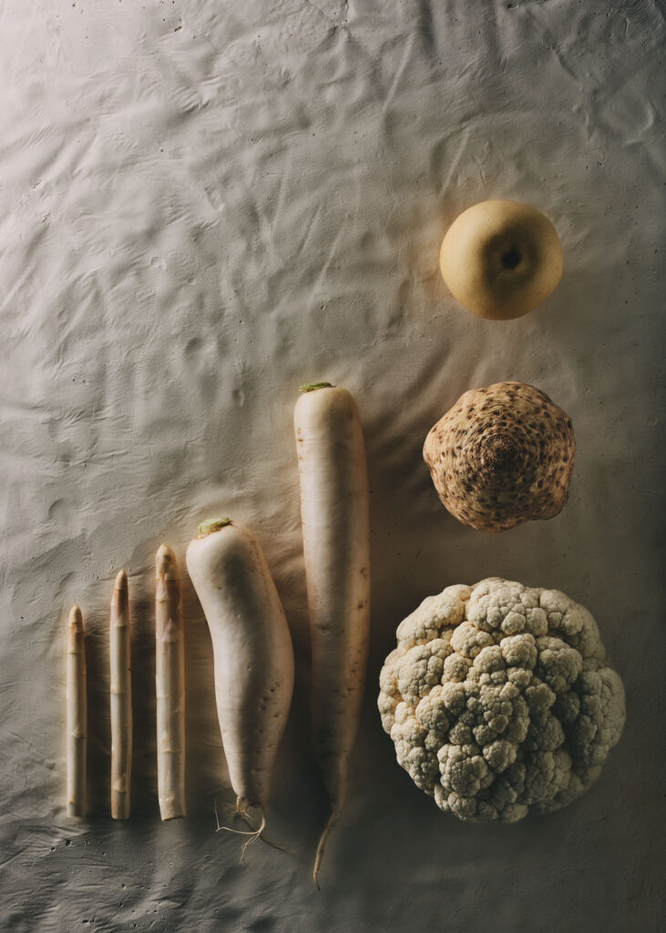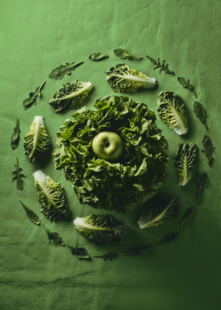 This series is an exploration of visual perception, where food photography meets fine art. What began as a conceptual study eventually evolved into a meticulously crafted food calendar, consisting of 13 unique color worlds. The core idea was to create monochromatic compositions where various types of a single ingredient—such as different lettuces—are paired with a „hidden“ counterpart of the same color, like a green apple. At first glance, the viewer sees a harmonious whole; only upon closer inspection does the subtle disruption reveal itself.